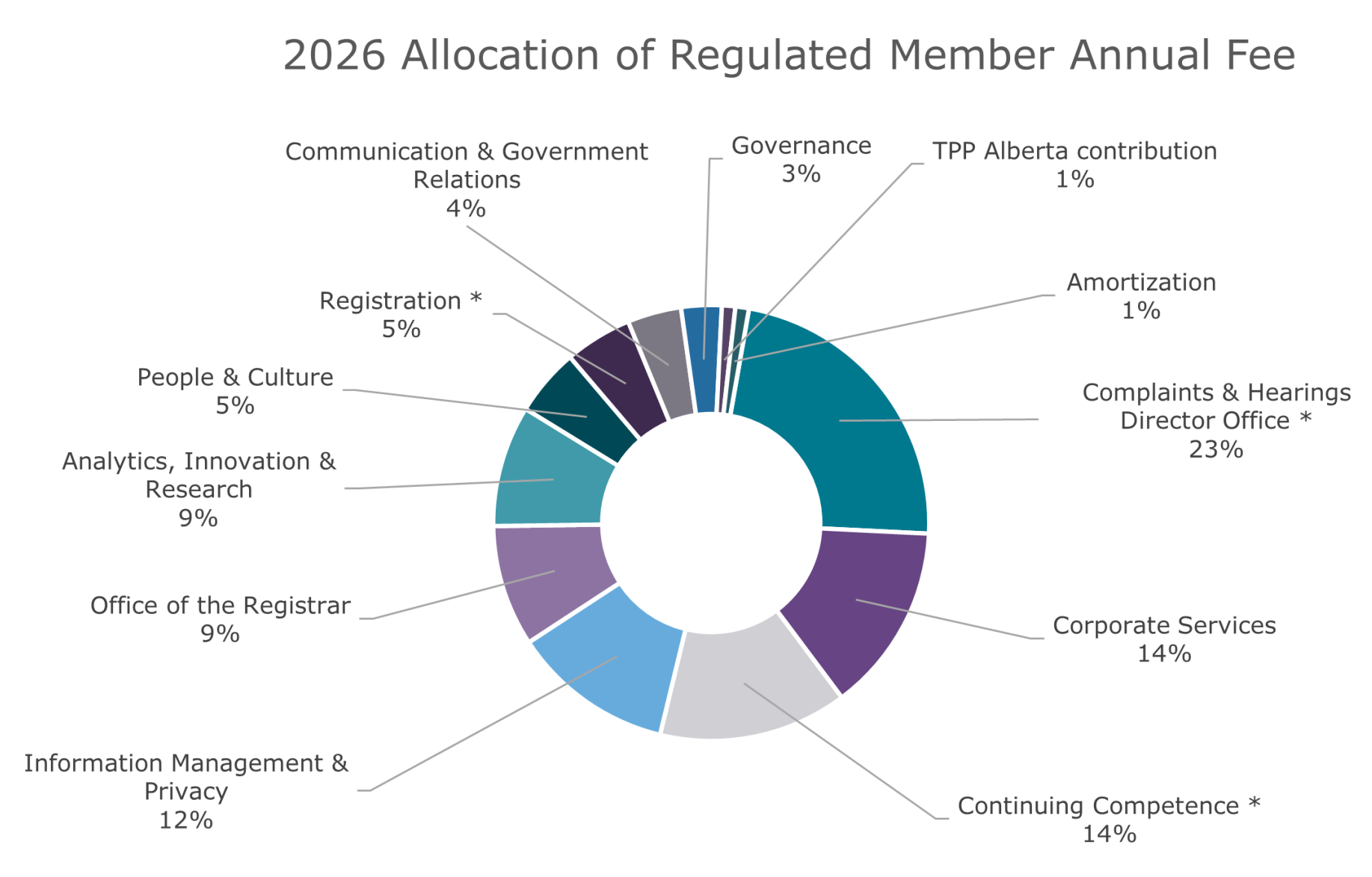 CPSA supports valuable programs with areas of focus ranging from quality assurance and improvement (Physician Practice Improvement Program, MD Snapshot, etc.), innovative research (Analytics, Innovation & Research team) and resolution options for complaints received about regulated members. Annual fees make it possible for us to support high-quality medical practice across Alberta. In the 2026 Budget, member annual fees are allocated between programs as follows: